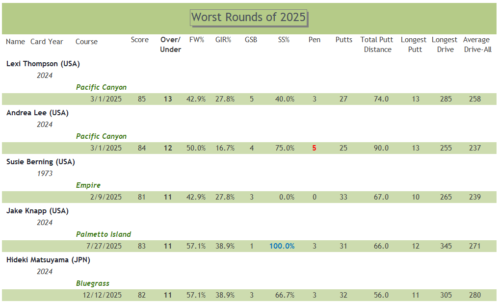 I added 512 rounds of golf to my database last year. Of these, 345 were with LPGA players (67%). As such, they are prominently represented among the most notorious performances of 2025: