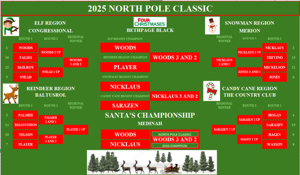Tiger won last year’s North Pole Classic, knocking off Lee Trevino (1971) 4 and 3 after the Merry Mex eliminated Nicklaus in the first round.